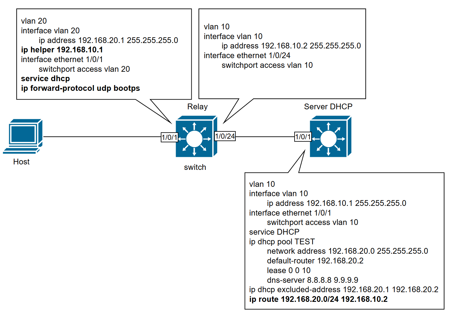 В случае, как на схеме выше, не нужно объявлять маршрут на relay коммутаторе. Однако если на пути есть другие подсети, то необходимо задать маршрут до сервера (со статической или динамической маршрутизацией). Должна быть установлена связь L3 между сервером и Relay коммутатором.